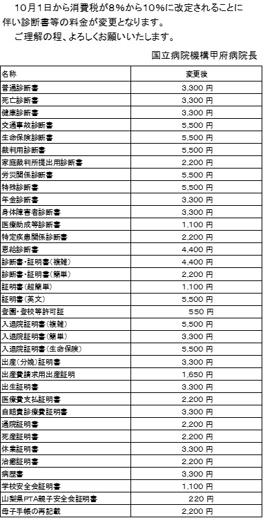 消費税10%に伴う診断書等の料金改定について