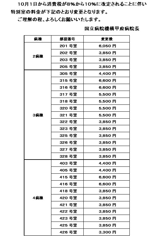 消費税10%に伴う特別室の料金改定について
